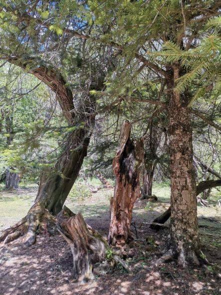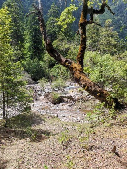 去往神瀑的路上,好多古树。枝干虬曲苍劲,黑黑地缠满了岁月的皱纹,光看这枝干,好像早已枯死,但在这里伸展着悲怆的历史造型,就在这样的枝干顶端,猛地一下涌出了那么多鲜活的生命,矫情而透明。