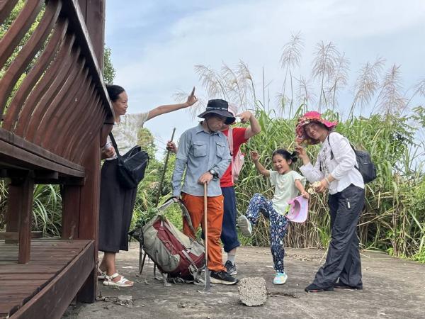 小昕母女在水库泡脚上岸后,小女孩专注地研究好久。