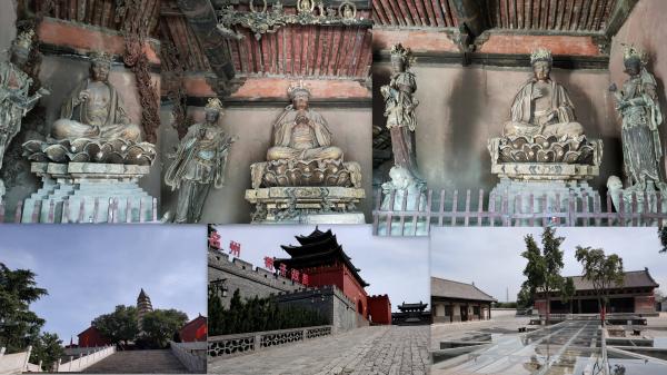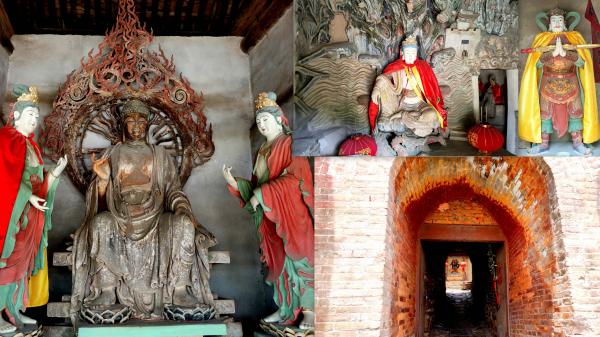 后殿七间,上下两层,现存明朝塑像,由于被盗过,如今做封存保护,室内砌了一堵墙,谁都不用看,省心。