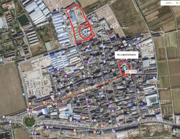 如今,由于清退违章建筑,工友之家所在的院落,里面囊括剧场、图书馆、打工艺术博物馆,已经夷为平地(卫星图中③的位置)。2020年,同心实验学校(卫星图②的位置)与众多其他打工子弟学校一样,也被命令关闭。