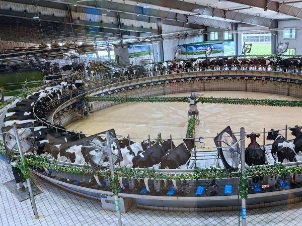 3小时的车程,到达了呼和浩特市西郊的土默川左旗敕勒川精品奶源基地,这次游学经历,真的是让我大开了眼界,别的那些怎么养奶牛的事,我都没在意,后来到了一个玻璃房子上面,看到了一个巨大的圆形桌子一样的装置,奶牛们静静的站成一圈,围着中间一块空地在慢慢旋转,开始我还以为是依照对牛弹琴的典故,给奶牛放音乐听,让它们学习什么理论用来提高产奶量。