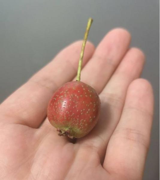 遇到一株柿子树,柿子青绿,要等到深秋才能熟透。最稀罕的是一些低矮灌木上结的一种像小个梨子一样的果实,燕子认得像家乡一种药用木瓜。形色上说“皱皮木瓜”,开了眼界。