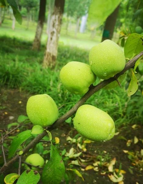 海棠也挂满枝头,青色的,还没熟。还有几棵矮矮的小山楂,结着小小的红果,味道微薄。