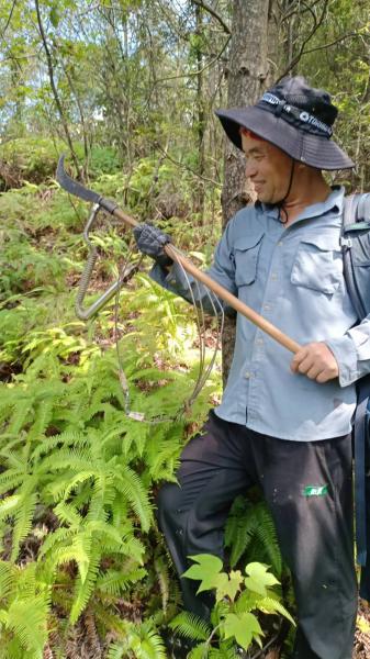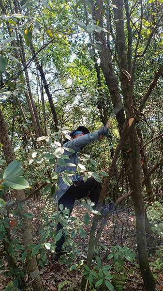 我们快速通过,陡坡下山,长陡坡上升,阿混一马当先。结果碰到二个大铁夹,用刀子去开,被套上了,取不下来,只好挥刀砍树,连索一起带走。