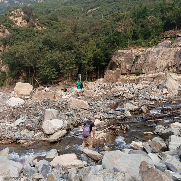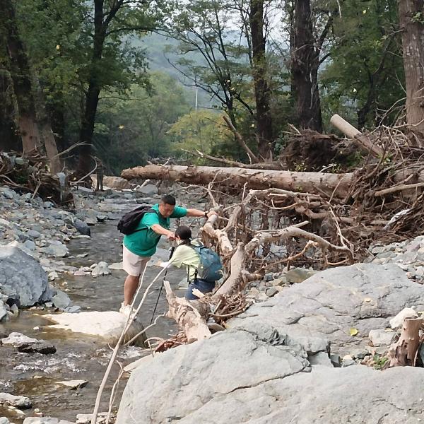 进入到瓜草地风景区路段,瓜草地以前是古道悠悠,溪水潺潺的景点,731这天就这样瞬间消失了,展现在眼前的是一片片石海。再往前路整个就坍塌了,不得已只能下降30-40米的悬崖,那对我来说就是巨石阵,羡慕大长腿们可以在石间轻松跳跃,没南哥的指挥我是真不去,南哥知道我不恐高也放心不少。