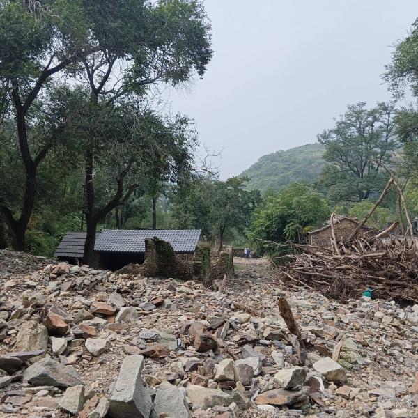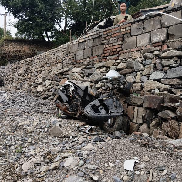 山庄上行与房子的主人攀谈,7月30日他就觉得不对,从来没遇到过这么大的雨,看事不妙赶紧把车停进院子里,已顾不上心爱的摩托车,水太大没敢走大路,翻后面的山回城,幸好他撤离及时,最高水位已没过围墙,院墙全被冲塌,上图的墙是雨后重砌的。