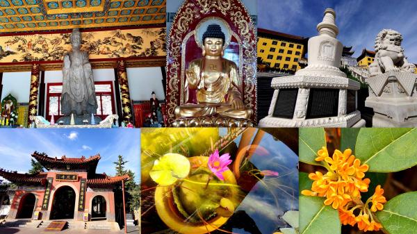 普照寺,不但有桂花大石榴满枝硕果,院内粉色月季颜色温柔,足足女人味。