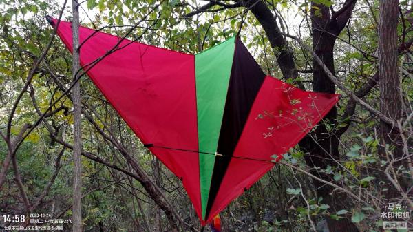 大裂缝西侧我最担心的灌木没有发现 ,特意带的砍柴刀也没用上上次恐惧的陡脊多走了五步就从东侧翻到西侧了,路豁然开朗,从路条看最少有两个队伍走过 ,一个布条标注是2021年,之后走很缓的石头沟朝西北侧上升,在沟前面发现一团彩色物品,第一感觉是遇到坟地了,近些以为是藏番,再看一个翼展2米的风筝。我把一段风筝线回收了,风筝又给挂树上了。