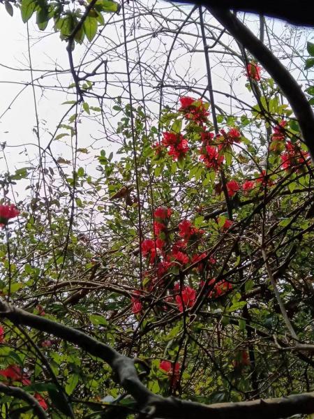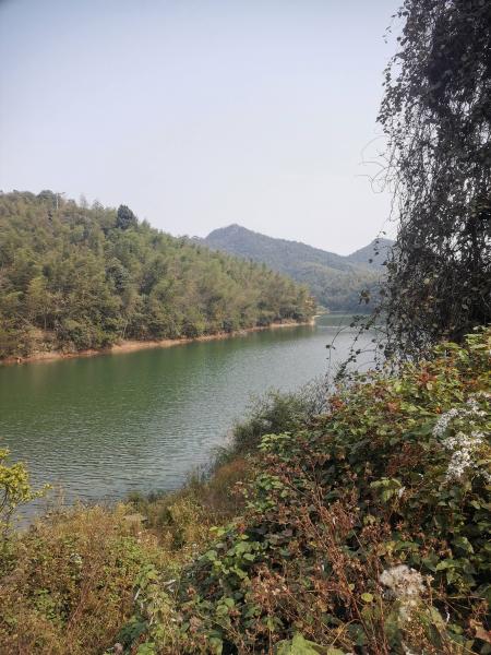 到山顶,湖光山色,波光粼粼,心旷神怡。湖边修复了一座庙,我们从左边过,就没去参观。小路荒废已久,周边除了盛开的映山红一无所有。山顶开了长长的防火道,计划的小路无从寻起,只得改变路线,走一步看一步。山脊上不停的上上下下,碎石又滑又乱,经常摔跤和差点摔跤。