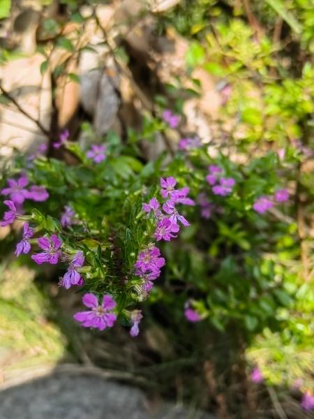 庙外阳光下 盛开的紫花满天星