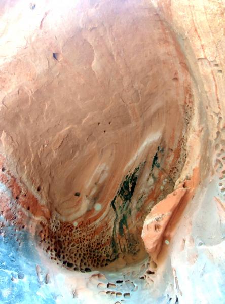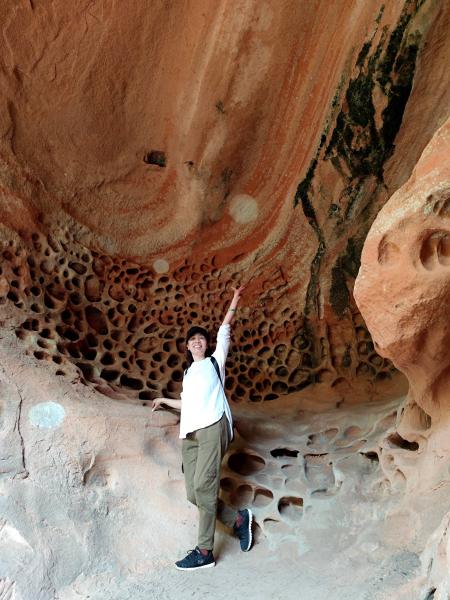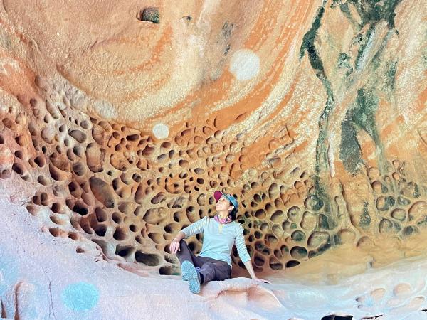 在阴元石旁边有十平左右的圆拱形小山洞,当地人称作“大地之母的子宫”。我细细看来,感觉更像大自然的神来之笔的巨幅壁画,一幅镌刻在石壁上的星空图。
