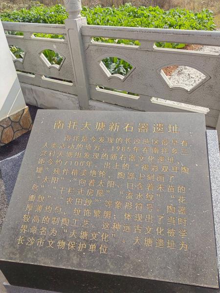 (大塘遗址——长沙市不可移动文物。是一处重要的新石器时代遗址,位于南托街道滨洲新村。据考证:该遗址距今约7000年,大塘遗址公布为长沙市文物保护单位。大塘古人类遗址里出土了一些精美的陶器,其中也出土了新石器时代中期的兽面纹白陶碗底。这碗底图案是最古老的饕餮龙纹,被近期史学界誉为“长沙龙”。该遗址也为探讨湘江流域早期人类活动的社会、经济、生活面貌提供了非常重要的资料,具有极高的历史考古价值。)