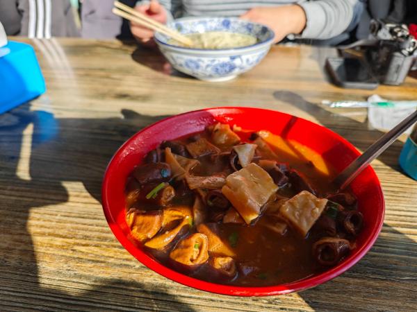 2.午餐是在涿州进京检查站南侧路西一个饭馆吃的。也许是寒冷加持的效果,我吃了有生以来最美味的卤煮火烧,纯肠(无肝肺)+火烧,火烧切成小块,入味深,肠处理得很干净,干货为主,汤不多,一小份23已撑得肚歪,口味份量价格都秒杀我上上周吃的32一碗的“百年卤煮”。值得专程去一次,涿州19路直达。