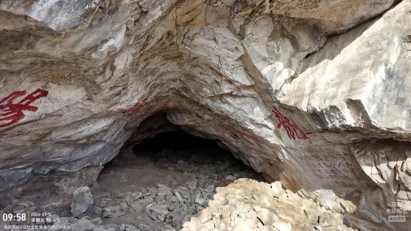 第二个洞是桃花洞,这是本地人叫法,官名叫朝阳洞 。主洞约30米深,平洞。变小洞之前地上有大量湿萱土,疑似野猪所为,为了安全起见小洞没有继续勘察。洞前有一米五左右卧倒石碑一个,麻面在上,疑似碑面文字在下面,由于找不到结实木棍无法翻身,所以无法证实,周边崖壁侧柏很多,胸径大的有40厘米左右,有被伐过的迹象,估计200年树龄会有。之后路差一点错过寺井古迹。