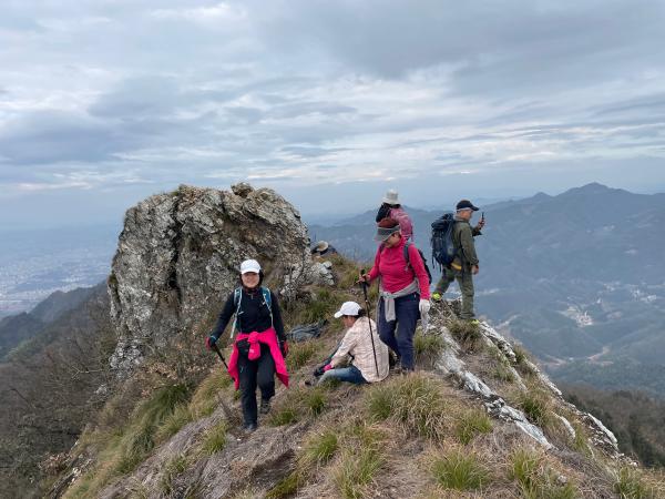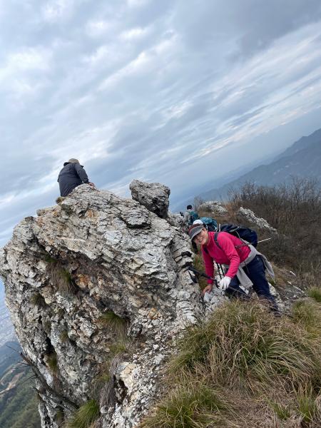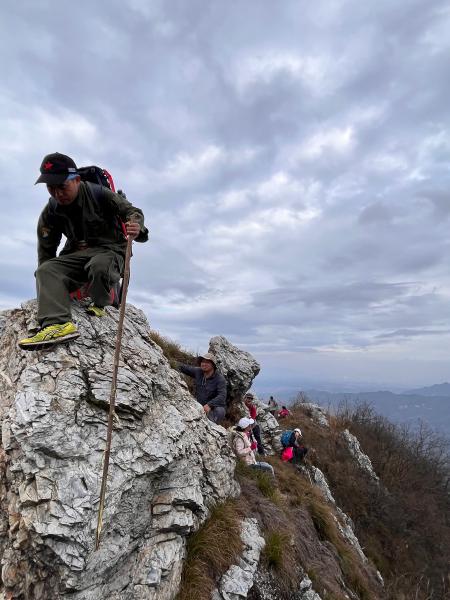 吃完路餐,打起精神,开始沿着山脊爬升,一路往南山势陡峭,如同走在刀背上,其间下到胸间的小路,蜿蜒曲折而行,最终穿过棕树叶林的封锁,从岩石缝里钻出来,再次回到刀削般的山脊上。