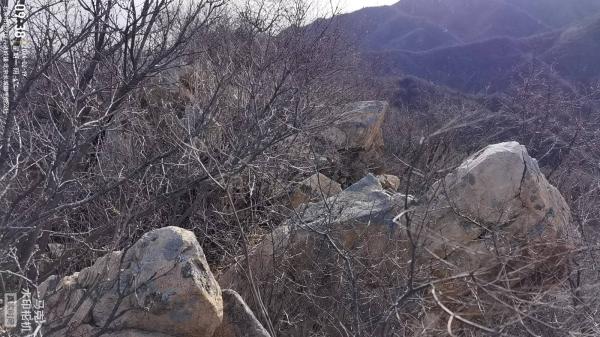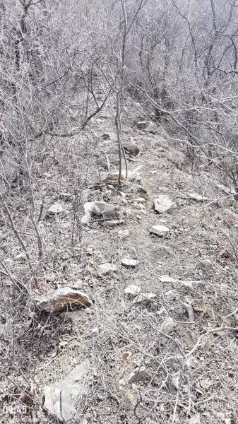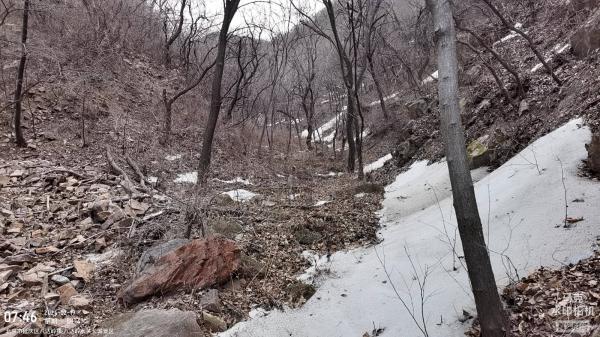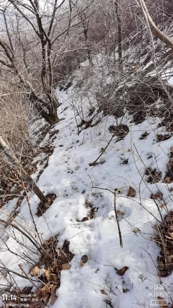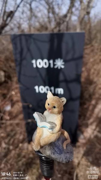 穿鸵鸟园北侧废料堆朝东侧上山脊,路过红石路134号电塔,顺脊曲折走到石长城接上了和钟山走的路线,有路,但近几年少有人走的迹象,这条路有多块长城公社界碑,多块红石新城界碑和公社界碑成对出现。之后是麻地路口,宽路可跑马。后边垭口桌子只剩桌面,支腿不见了,矿泉水整瓶的还有5瓶左右。登上1001峰,六只脚显示海拔是993米。下山路有积雪,缓坡曲折下降,适合老年人体能,雪很瓷实不湿鞋。茂密的松树林绿油油的,树下只发现一处墓地,松鼠没有偶遇。旗杆岭有个古槐树520岁了,后边是龙王庙,没有龙大人塑像,三面墙壁是斑驳破碎的彩色壁画。莲花滩公交站是在高速路桥东侧过一个限高2.1米杆。车站南侧像是一个废弃垂钓园,门口两个石狮子,西侧石狮子前左脚掌一个指头被切割机割去了。陈旧大门紧锁,方钢焊接的栏杆局部已经腐朽,轻易可拉断。院子里面有个亭子,旁边有个黑色怪兽挥舞手臂,转个角度看像是个狮子。100多米南边还有一只同样的,显然是一家同类。12:20结束活动,13:00莲花滩Y17准时发车,活动比计划提前4个小时完成,很轻松。