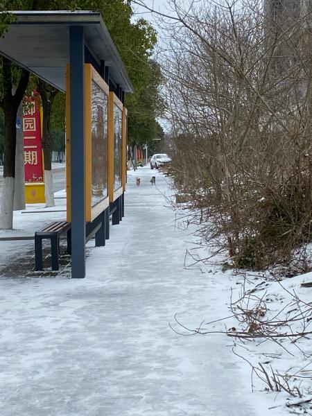 仔细看这路上的雪,我估计喔(没去科学求证)。先下的冻雨,固住了地面,又下了雪籽儿,然后又下了雨,后又下了层飘雪。于是这路面特滑,但幸好我的鞋够抓地。