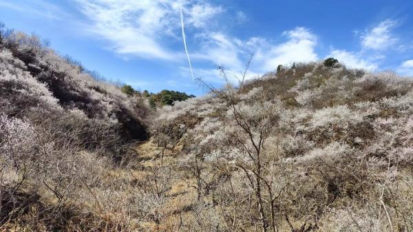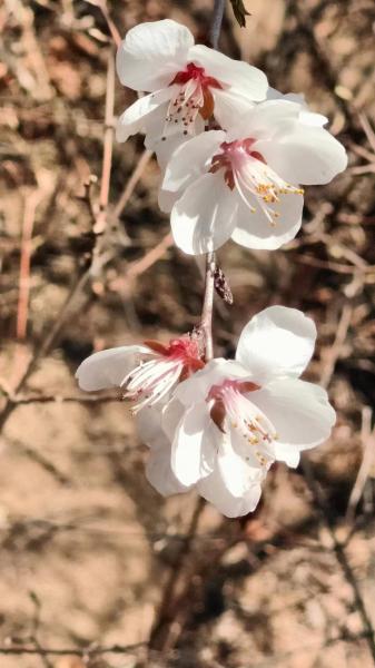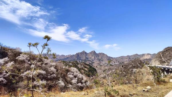 伊宁提前乘上了8.00发出的早一班车,其余四人,soso0、新姚、相伟和我,则是都坐了计划里8.20的昌31。早一班车到南邵的时间基本正常,计划里的班车则明显晚了些,大概10分钟的样子。10.00刚过,伊宁抵达海字村的时候,我们的公交还没到兴寿。后车到达徒步起点的时候,已经接近11.00了,比正常耗时多花了一倍多时间。好在,眼福从公交车进山就开始有了,公交沿线多是经济果木,山桃难有生存空间,但陡坡和高处,山桃花如团团云雾,点缀其中。