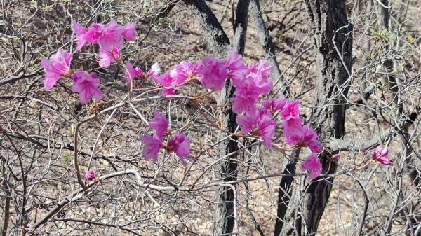 直接下山的路是羊标高速等级,收获也是大大的,左侧坡上,杜鹃花比比皆是,大饱眼福,照片记不下紫红色的娇艳。据说是国内唯一的木本菊科植物蚂蚱腿子也已在绽放。