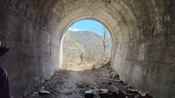 岔道口村口的值守人员没理我们,沿途也没见其他人盘问,我们到铁路隧道遗址文物指示牌的时间也还是10.21,我提示大家走*右边*的铁路路基上的小道,只有水怪坚持走130县道,他要探明究竟如何从县道下来隧道口。10.27来到拉海岭隧道口,稍停,水怪也从隧道上方绕行下来。