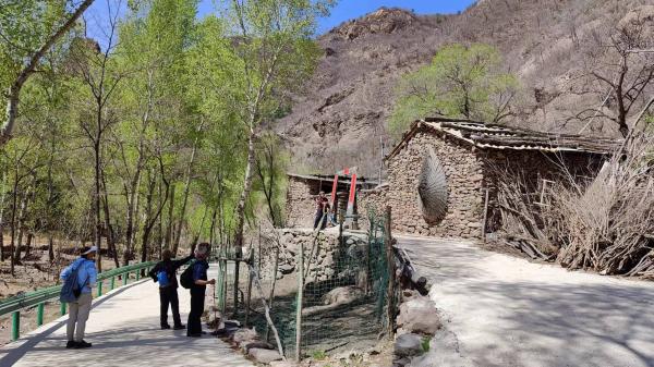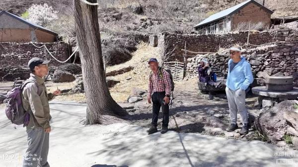 有几处房子,看起来已经老旧,但一处房上装了彩钢房顶。有人告诉我们,这就是刘营村的大冰沟(自然村),现在还有两户人家居住。路边有一个碾盘和一个磨盘紧挨着,我们正好借地儿午餐,时间正好是午时,里程记录是11.8公里。硬化路到此终止,村尾最后一家的老妪说,硬化路是近五年内修到这儿的。