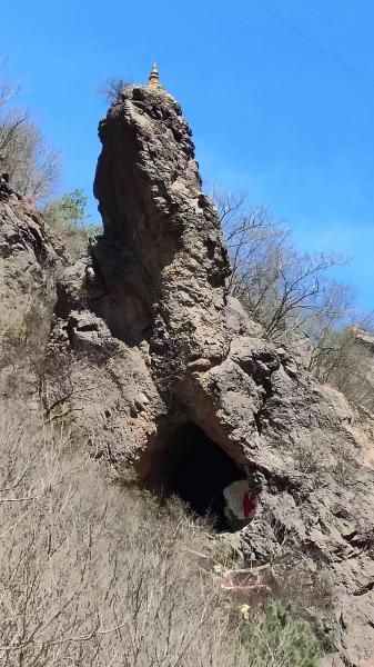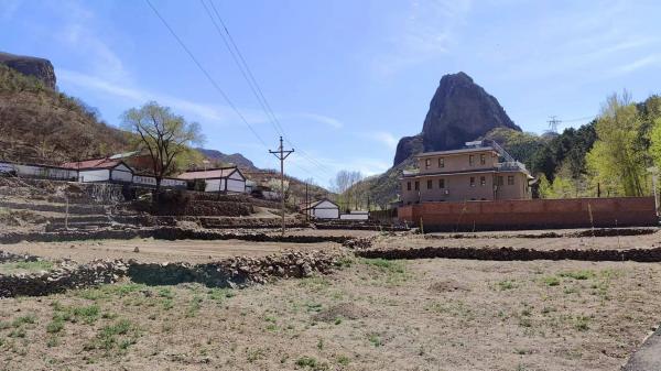 直行,远远地就看见矗立着一座尖山(后来有人告诉我们,这山就叫尖山子),很有气势。山阴路左,就是刘营村,我们到时刚过11.30,里程大约10公里,由此开始上升明显。然后石门上自然村,这里也有几户人家,部分房屋还有老式的烟囱,大概用作烧炕排烟。出现大冰沟自然旅游风景区彩画的时候,左转,有点儿坡度的混凝土路已见有裂缝,右侧的绿漆护栏看起来还新。第一处景观显现,底下有洞的石头像一只乌龟,头顶上有一个卫星的尖塔,所谓“神龟望月”。