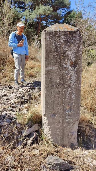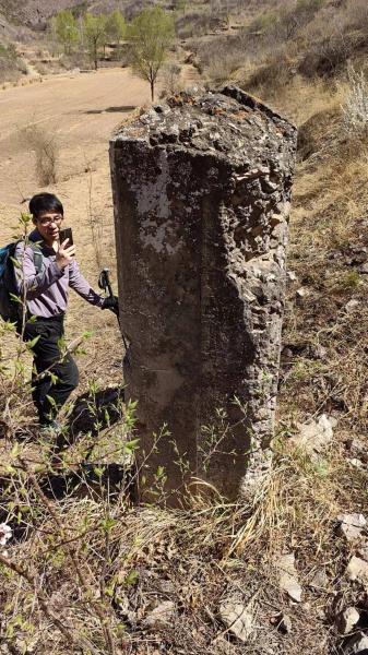 接近机耕道旁一个院子的时候,我们见到又一块文物安全责任公示牌,跟西沟那边的样式一样,只是地理位置坐标及责任人信息不同。公示牌后是一片平地,现在已经翻耕平整,踩上去软软地。旁边的山坡上,有一块四方柱形水泥碑,一面刻有“拉海嶺隧道及折返線建設工事從事員殉职之碑”(“員”字“厶”头“)字样,另一面可见字迹轮廓但基本难以辨认,另两面则是字形都看不清了。这块儿地形开阔而平整,我怀疑是当年大北沟车站的所在。