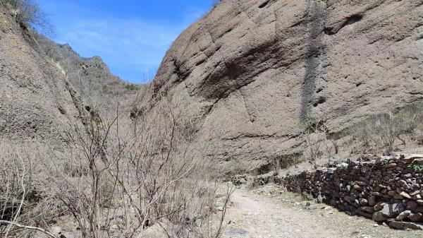 出隧道右侧是一块平地,就看到一条向右的岔道,我决定就此离开铁路遗迹。这条岔道很快就是下行,下到梯田就变成机耕道,指向大北沟村方向。我原本设想是在通过2号隧道后才向下寻往第二层路基的,这一来有所提前,直接走到了第二层铁路的下边,估计比规划路线节省了1公里的样子。回来搜索并对比,发现这段我们走的路跟小撮2018年《6月9日出走岔道口-刘营-色树沟》的轨迹大致相同。