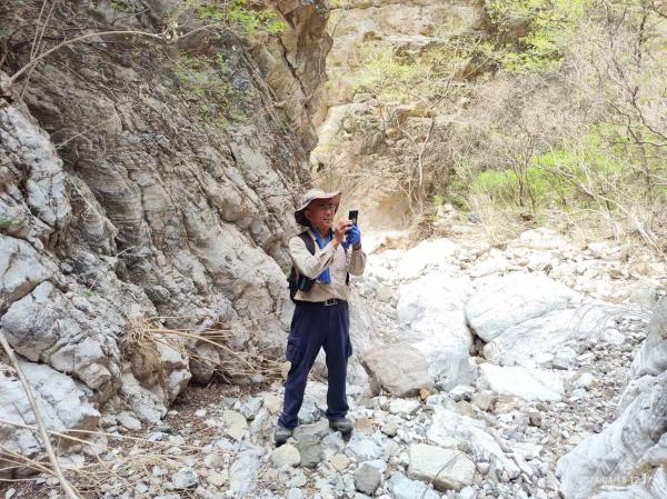 再往前已经知道离开高芹路,没有折返自然是这段水泥路很有吸引力。首先不知此路通向何方,其次这路上一辆车没有还晒不到,后来总结除了集合地是确定的其他一切都可随机变动。水泥路通向一片果园,在山里这个规模可以算作很大的果园,密植的苹果树含苞待放。两男一女在清理果林里的碎石,去年大洪水的遗留。出果园水泥路改机耕道,在和另一条沟汇合后大路嘎然终止,向右有石砌的台阶通向山坡,但是被堆放的苹果树枝阻拦。沿沟前行看到遭洪水洗劫后残存的路段感觉沟里有路,也知道前方进入九河沟,行至此地感觉拜访山神庙的愿望需要另一次课题了。