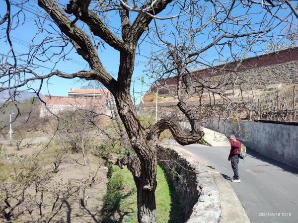 机耕道可以返回山神庙,只是时间尚早(14:00)不甘心等几个小时的班车(马套17:00发车),或者还是不甘心没有下到九河沟,决定到马套坐车。机耕道通向几处梯田前些年的玫瑰在更换为新的果树,在一处拦截的岔路口我们毫不犹豫的选择坦途,再次遇到断头路,再次进入小路钻灌木,又看到了九河沟底的公路,最终折返。毫无沮丧之情,心甘情愿去拜山神。