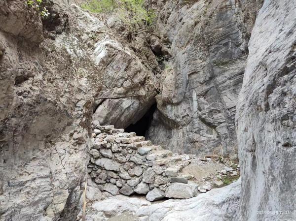 在一处左侧的路眼离开沟底以为是要绕开可能出现的壶,可是直到能看到九河沟里的水泥路,这条小路也没再放回沟底,通向的支脊也不像下到九河沟的村道,起点路就不够村道级的宽度,脊上还有些发散,我和癸哥走过九河沟知道两侧岩壁的险恶,没有路是万万不敢尝试下降的,非常坚决原路返回,也看到了对侧山坡横切小路,感觉应该退回果园走台阶路上另一侧山脊。12:00回到梯田午餐,决定再去看看沟里能否通行。壶确实出现了,有人工修建台阶,非常坚固,经受住了大洪水冲刷。