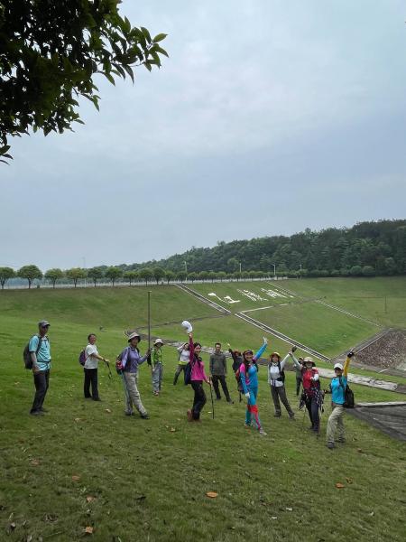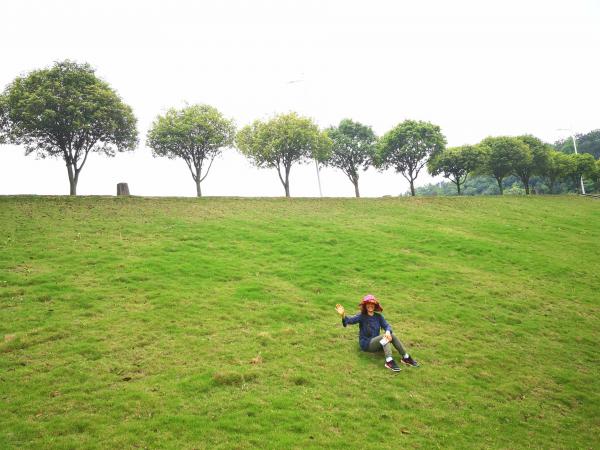 不知道怎么绕来绕去的,穿过山坳小坡,田间屋后就到了红旗水库管理处,现在水库都叫“湖”了。坐在绿茵草原般的湖堤坡,挥手来一张,四周空旷,心情愉悦!