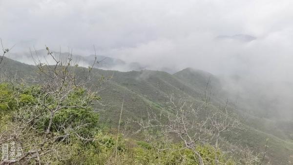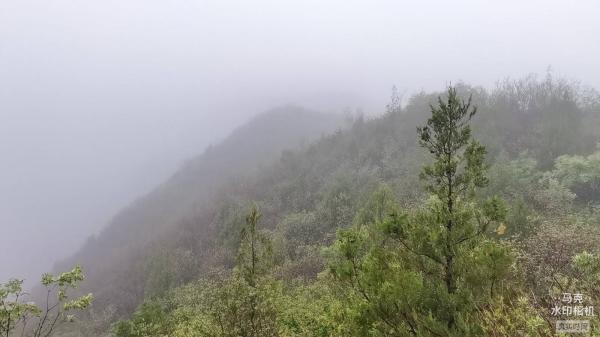 山脊确实有路,路网也有显示,就是走的人太少了,灌木太高雨水积的太多,不打积水就是一阵淋浴。过黑寨顶海拔是510米,云雾缭绕只能看见50米内距离,之后沿着一条成型路走一看轨迹还是方向错了,撤回重走,灌木高大茁壮一小时走不了一公里。中午云散去,可以清晰看到西侧的王家园水库,下午两点半走到羊熬垭口,果断朝东下撤,路很成型,灌木稀疏,可惜裤子大腿内侧开线一尺长,带的针线这就用上了,耽误一刻钟,同时把干袜子也换上了。