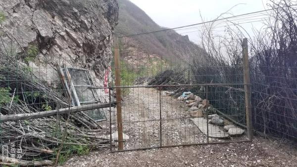 一半土路后就是水泥路了,只是沟口有两道铁门锁着,必须翻越。熬鱼国际沟正在修路,过水库我是走的沟里土路,在库北侧先穿了一个养猪场,两个大猪散养有野猪风范,见人狂跑,有个铁栅栏门没有锁,轻拉轻关即可走过。大坝处的铁门就必须翻越了 ,只是技术难度不大。兴隆口防火站还是有两处有人值守,只是出去没人搭理我。