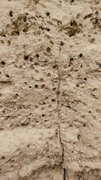 残长城敌楼,包砖一块不存,地上见有几块碎砖头。敌楼北壁密密麻麻的空洞,应该是某种动物栖息繁衍的遗存。
