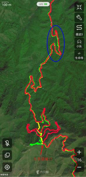 4. 课题起点河口公交站至终点营盘公交站直线距离7.4公里,走友京都水怪抄了两次近路,六只脚录得里程15.1公里,累计上升552米,累计下降250米;我另部手机也用六只脚,录得里程17.1公里,累计上升615米,累计下降309米。参考轨迹在垭口之北也是抄了近的,下图红线为课题实录轨迹,黄线为京都水怪抄近路轨迹,绿线为参考轨迹,蓝色线圈内注意到有抄近道: