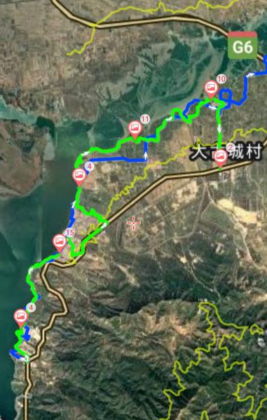 - 我们尽可能贴近水面行走,能亲水的地方视野开阔,走起来很是舒服,但总有不能贴近水面的时候,首先遇到的是天堑:一条河谷的对面,缓平的土坡接近水面时是90°的陡壁,水库没了护坡。我们只能离开水陆交界,在土坡上的梯田里寻路,再回水边时有沼泽,很快还不得不在水库护墙上走,这时风力有点儿大,走在上面恐高的人直犯怵。有上有下有横切,陡坡峭壁加灌木,爬山的感觉。看地图,这附近有两个村子,颜家沟和北寨。
