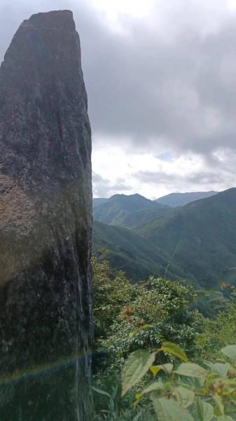 一直观察右边山势,寻找下山之路,右边高山一列列,山脊陡峭,山谷幽深,下山口在绝壁附近,寻找没找到,左手好像有一条小路,下去沿路补充水,碰上一对养牛夫妇,询问下山之路,说有10公里到机耕道,刚开始没有反应过来,突然确得不对,脑袋飞快转动,才发现,这条路可能是下到巡田乡,与我停车方向相反,立马返回,这时脚开始抽筋,只好坐在水边休息,上药,20分钟好了,返回到悬崖峭壁边上寻找下山口,功夫不负有心人,终于找到了,原来要从一块凹进去石壁上跳下去,沿悬崖峭壁边框下50米,这才上到下山小路,这时已经5点多了,山里开始暗下来,终于在天黑之前,下到机耕道,这里居然有一片怪石。