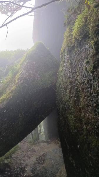 我们吓得不敢出声,半小时后,才出来查看,值守人员拍照后要回去报告,叫我不要乱走。我观察一会儿,犹豫半天,还是决定上去看一下,确实不行则返回。还好只有最初入口被乱石挡住,上面小路完好,并且塌方长度不长,我快速越过乱石,上到小路,快速绕过塌方,后面都是之子路上升,上到山脊垭口右边是石庵,只留下满是苍桑岁月枯树。