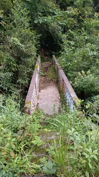 沿古道峡谷前行,过第一溪水,先抛石无用,后砍竹子搭便桥。