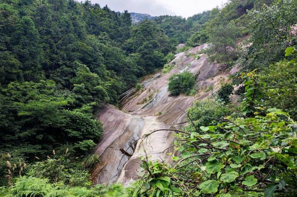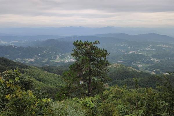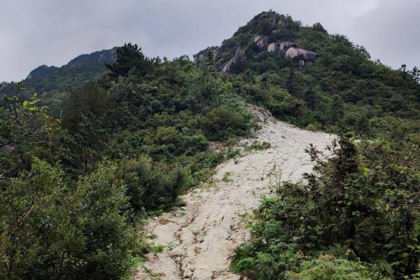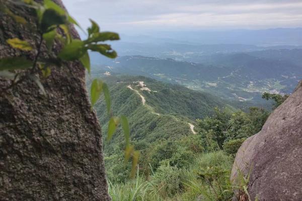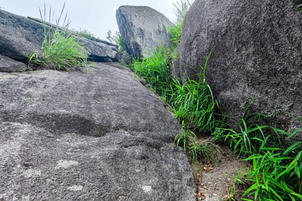 登山小径起初是麻石砌成,宽约一米五,人工开凿,并不规整,且只铺了数十米,之后便是土路,隐入竹林。随着高程不断升高,植被也逐渐发生变化,从低处的竹林到高处的松树,回望身后,山下的民房已经如火柴盒般大小。查看了两步路上的轨迹,登山路口到只角楼的路程约7公里,但爬升有1000米,其陡峭程度可想而知。在海拔1080米左右,小径从林中穿出,最终与一条防火道汇合。抬头望,上山路都是巨大花岗岩,怪石嶙峋,几乎没有树木生长,仅有不多的矮小灌木和杂草。