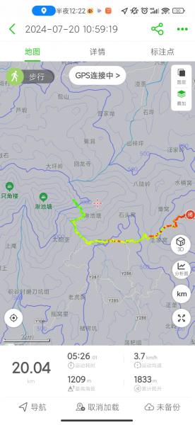 开题人继续手脚并用,向上爬升到1200米高度后,坐在一处凸出且平坦的石头上稍事休息。看规划轨迹,离登顶还有4公里左右,爬升约300米。面前的石头宽一米多、五六十公分高,本想试试能否上去,但发觉山上风力渐强,人稍微站起来,就被吹得摇晃,而且两侧均为陡壁,对有点恐高的开题人来说极不友好。看看时间,已是下午两点,综合分析上山路况、天气状况以及返程时间,如果继续登顶,即使顺利可能也要六点才能返回黄龙寺,开题人果断决定还是原路下撤。