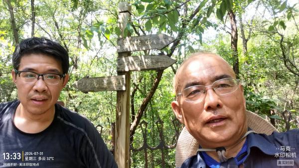 7:40集合完毕,穿过桃林村过了铁路桥就直接上山了,首先状况是都湿鞋了,昨天树叶及草丛雨水一夜也没有蒸发完。路迹明显,过了第一个制高点下降又上升,前面有岔路,右转走了有500米,路迹没了 , 地上垃圾很多。(正确路应该刚才不右拐,直接上峰走脊,那样今天完成应该更快些)按照大数据分析只能朝东下撤,北侧是5米高陡崖。一路朝东南逐渐有路,中间还有一个混浊大泥塘,这一定是野猪的娱乐场无疑了。离100米就到滑雪场草地了,为了躲避管事的麻烦,果断从东北侧碎石坡下撤,路不难走有灌木树枝可抓。东侧这个沟应该是跑草地摩托车的,标识清晰,摄像头密布,可是没有营业的迹象,摄像头杆东倒西歪估计也没信号传输,反正也躲着点为好,贴北侧草丛朝西北走目的是上北侧森林公园的山顶亭子,北坡看起来很陡,没有一点路迹迹象。顺着草坪进沟,倒是有路,走了有400米左右,有梯田和石头墙,大西瓜说右侧有条像路,于是右拐干拔,路逐渐消失,这应该是一条植树路。遇灌木,带手套,有断崖,找薄弱点攀登,终于到脊,用了有一个小时,这段路真费力气。天依然是闷热好费水。山脊朝东而下,隐约有路,不是有很多人走过的迹象。12:48到了垭口,有路南北走向,朝东侧没有路迹去亭子方向。于是顺着路朝南走,左转横切山坡,此路应该是个古道,当初应该能走驴,现在灌木丛生经常要低头哈腰,平路走的都有多次不断坐在石头上喘大气喝水。大西瓜声明不能再爬升了,水只剩500毫升了。13:32终于到达森林公园垭口座椅上,好好出了一口长气,这个横切路真干净呀,一点垃圾也没有,平常生活嫌弃垃圾,爬野山遇到垃圾是一种喜悦感,有人气就有出路。看看轨迹还差7米不够计划爬升,于是朝南侧观景台看了看。朝北侧亭子指示牌显示还有1800米,弥陀佛,以后再说吧,腿真无力了,大西瓜多一步都不想走了,抱着那500毫升水就下山了。天鹅湖里面有12只天鹅,只有2只是白色的。铁大门挂大锁,关键是有人值守,要是没人从天鹅湖边矮护栏也不难翻越。嘴上抹蜜先说走错路了,后说宽大处理一次,不错人家真给开锁了,说今天闭园,区里通知有自然灾害。教堂里面借用洗手间洗头洗脸,就是卫生间标识非常古怪,要不是脑洞大开就有进错门风险。礼堂里面空调大开,有个单位今天包场晚上搞团建。休息20分钟很舒服,这里还有免费waifai。之后就是马车动物园拍照环节,火鸡、山羊、小马驹都可以互动,摸了小马驹脑门它挺享受。之后过了售票处,出大门没人干涉,挺好一天。15:35上了公交车就有小雨来落在了挡风玻璃上。