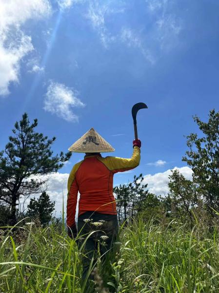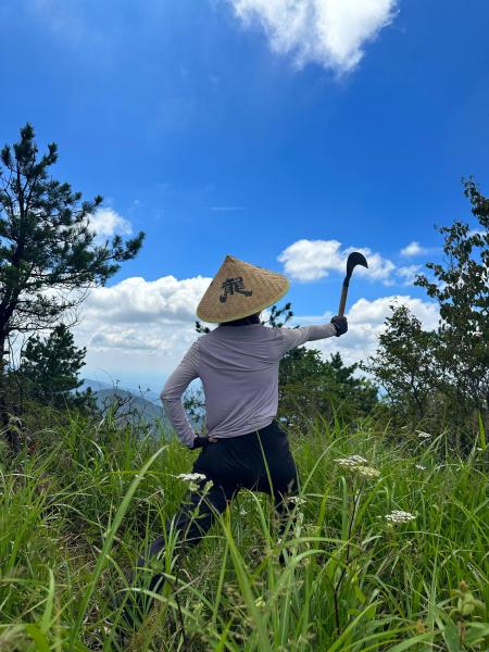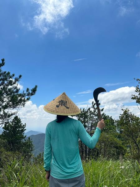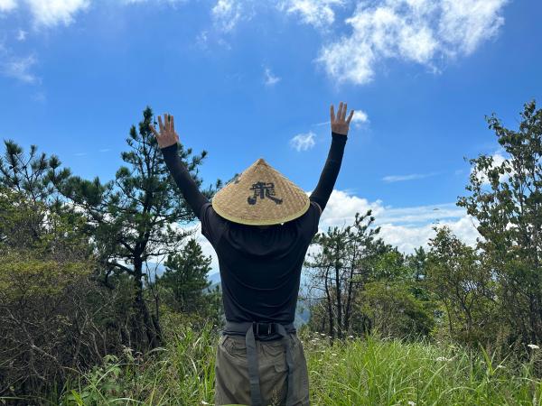 吃过路餐稍事休息,13:00准时出发,顶着烈日,在光秃秃的山脊防火道上笔直向上,把蓝天白云甩在身后,享受汗流不止的爽快。到了丫髻尖,大家借着忆梦姐的黄龙寺斗笠,狠狠做了一回自己的龙大侠。
