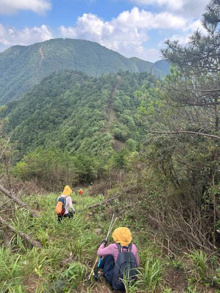 以为就这么轻松愉快的走完后面的行程,哪知这才是挑战的开始。中午12:30到达山脊线的起点,我们在这里路餐修整,经过200米的爬升就能到达今天线路的顶点丫髻尖(这个地名地图上查不到,是万象哥翻了县志确定的),海拔1580m。