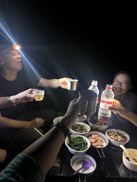 扎完营,赶紧准备晚饭。万象哥主厨,大家伙一起配合,菜品营养丰盛,色香味俱全,有图有真相。不经意抬头,天上的星星眨呀眨,地上的萤火虫飞呀飞,还有徐徐吹来的山谷微风,让人沉醉的夜晚。是夜,大家伴着虫鸣和溪水声睡去。期间还有村民骑着摩托车经过,我睡在大马路上,心想着要不要起来让路,好在他们技术一流,直接从侧边开过去了,下次一定记得带齐装备。