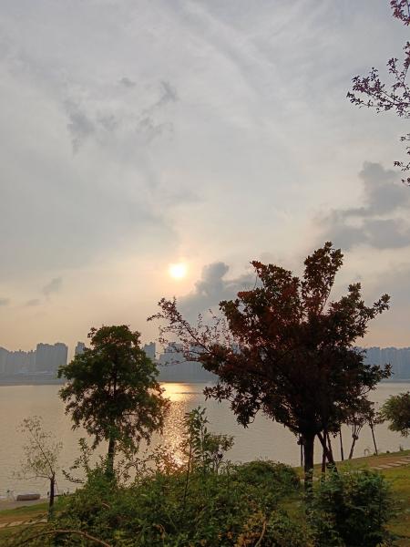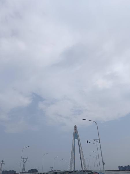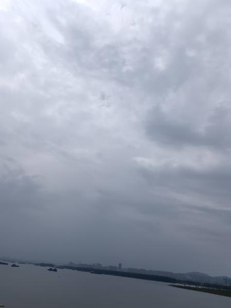 7:04分,停下来拍几张,湘江边的太阳,正好面对太阳,站在绿色草坪上,几遍拜日,舒展放松身体。不一会,开题人来了,体恤短裤,背个破包,吆喝一声没有停。我在想,不会有好吃的吧,比如昨天采摘的莲子?想多了,反正没有吃的,应该是写生的物品。穿过三叉矶大桥,继续向北,看到前面乌云密布,是不是要下雨了呀?大约8:00开始下雨,左边正好是潇湘北路施工队办公点,蓝色拱牌门上写着湖南乔口建筑公司,施工队、骑车的都往办公点去躲雨。从8:04~9:35,站在门口玻璃屋顶下,进进出出都是年轻人,一个瘦高个小伙子提着两大袋紫葡萄,还提着早餐,后来他客气的走出来跟我我,可以到办公室坐,这雨也不是一时半会的事。感谢,有温暖到,多看了一眼他手中提着的半串普通,还有左边厨房里端出来的炒饭炒粉,好像酱油放得多,都是咖啡色的。水在右边会议室,洗手间在左边,简单干净,还有食堂,是不是不要担心下雨!