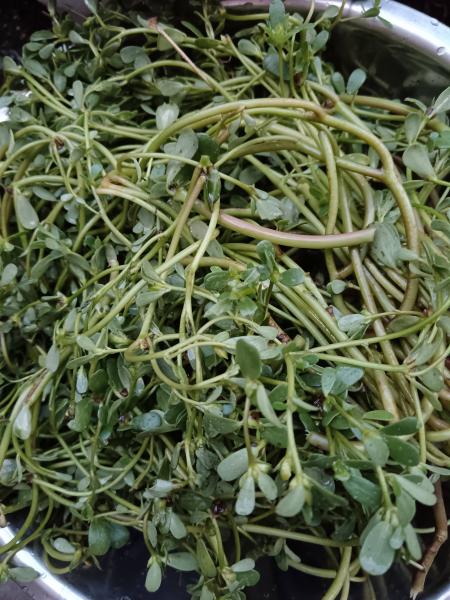 金黄稻穗,深绿禾田,在蓝天白云下都清晰养眼。田边深草处,几经寻找才见到墨旱莲,长得壮实漂亮。路边随处可见桑叶,清新肥嫩,还有人工栽植的硕大油茶果。最没有想到的,是路边特别多马齿苋,由小而少,到多而肥厚,人人实现马齿苋自由 ,只要你提得动,背得起,要多少🈶多少。