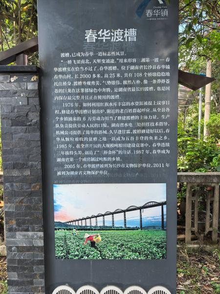春华渡槽长2000多米、高25米,108个桥墩稳稳地托住桥身。每逢春灌时节,春华渡槽就会开槽放水,渠水在云天中流淌,奔向广袤田野。1978年8月3日,渡槽竣工、引水东行,灌溉滋润数万亩农田,春华渡槽现已成为湖南省跨度最长、保存最为完整、至今仍在发挥效益的大型水利设施。