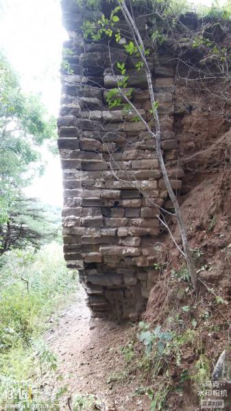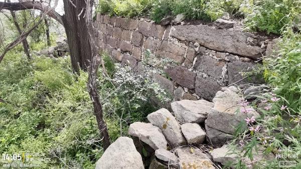 到了山脊就是松树林,路发散草丛有点密,摸索着走不起速度。松蘑很多可惜无缘享受。12:50到了大平台一根木杆山顶。下撤走沟很爽,发现一座砖砌敌楼可见到三面墙,下半部分砖块已成粉末。沟底一棵树下有个洞,深有60厘米,溪水从里面冒出,看来是个季节泉,从地貌植物判断不像长久泉。走了一公里又遇到了一座石头屋轮廓 后面巨高石头堆,明显是古迹。之后又遇到石头长城,还有两块白河堡自然保护区木桩。遇到一个放羊人40多岁姓陈,他有200只羊,去年收购价13元一斤。那个酒庄故事是他告诉我的。他的裤子膝盖处磨了很多洞,我说买个军裤挺好,他说迪卡侬比较结实。